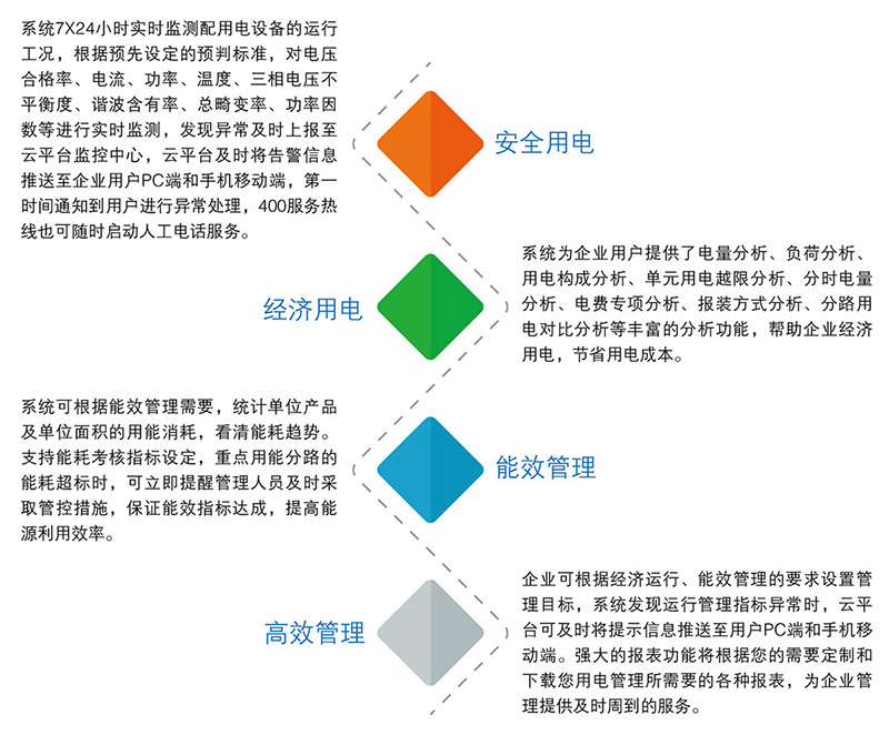 配用電監測與管理系統通過應用物聯網技術、云計算技術和移動互聯網技術使得企業配用電管理智能化的成本大幅下降,集中建設在云端的云平臺監控中心,為全體用戶提供7x24小時不間斷監測服務,用戶可通過本地PC端或手機移動端及時獲知本企業配用電信息、異常告警信息,定期獲得運行分析報告,手機App隨時隨地輕松查詢,全面監管企業的安全用電、經濟用電及電能質量指標。